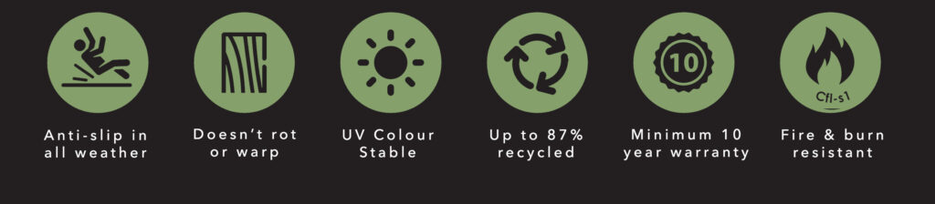 It will always look brand-new. Unlike timber, composite boards do not split, rot or splinter, meaning they’ll never need costly repairs or replacements over their life cycle. And to prove our commitment to quality, we offer a minimum 10 year warranty on our boards.